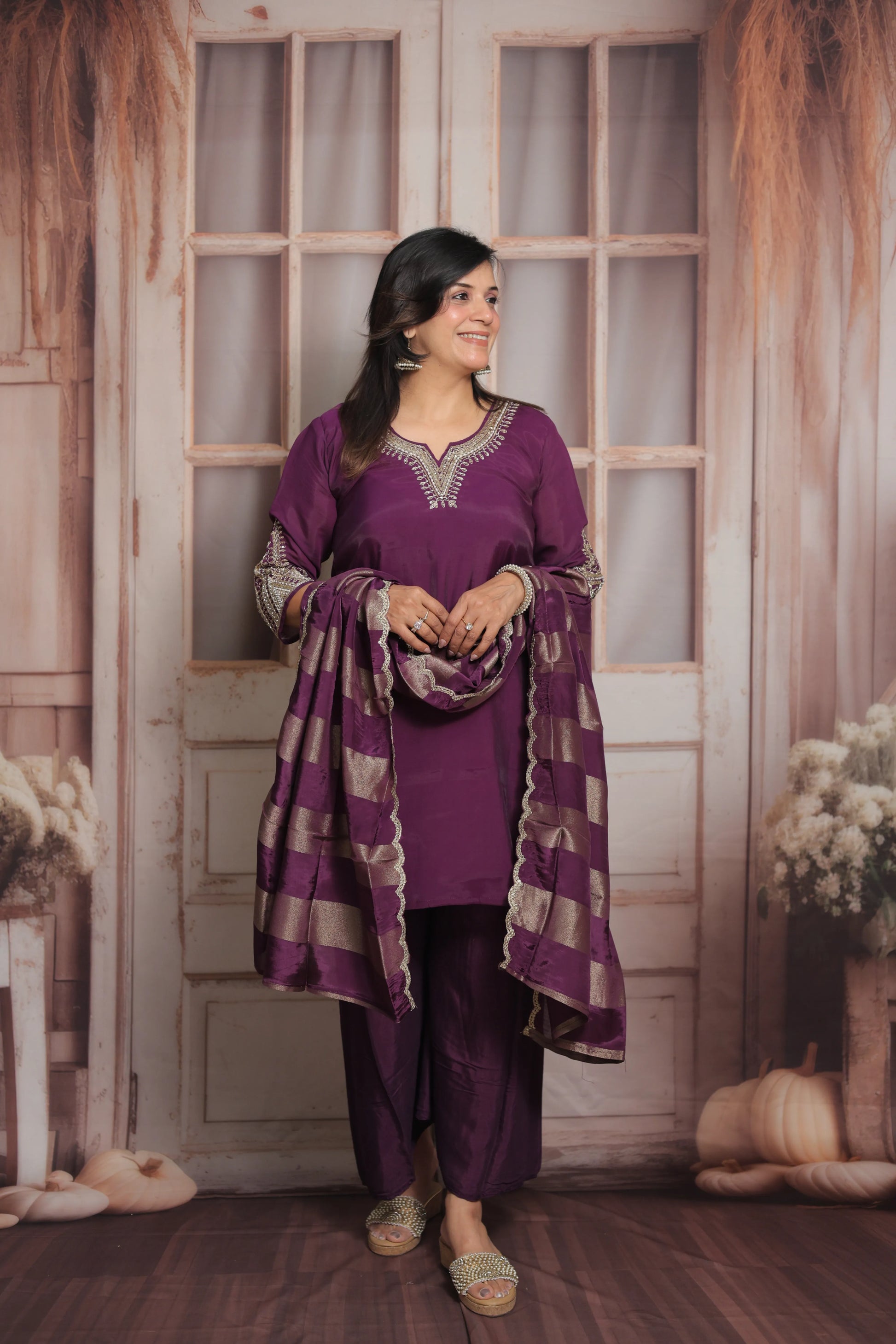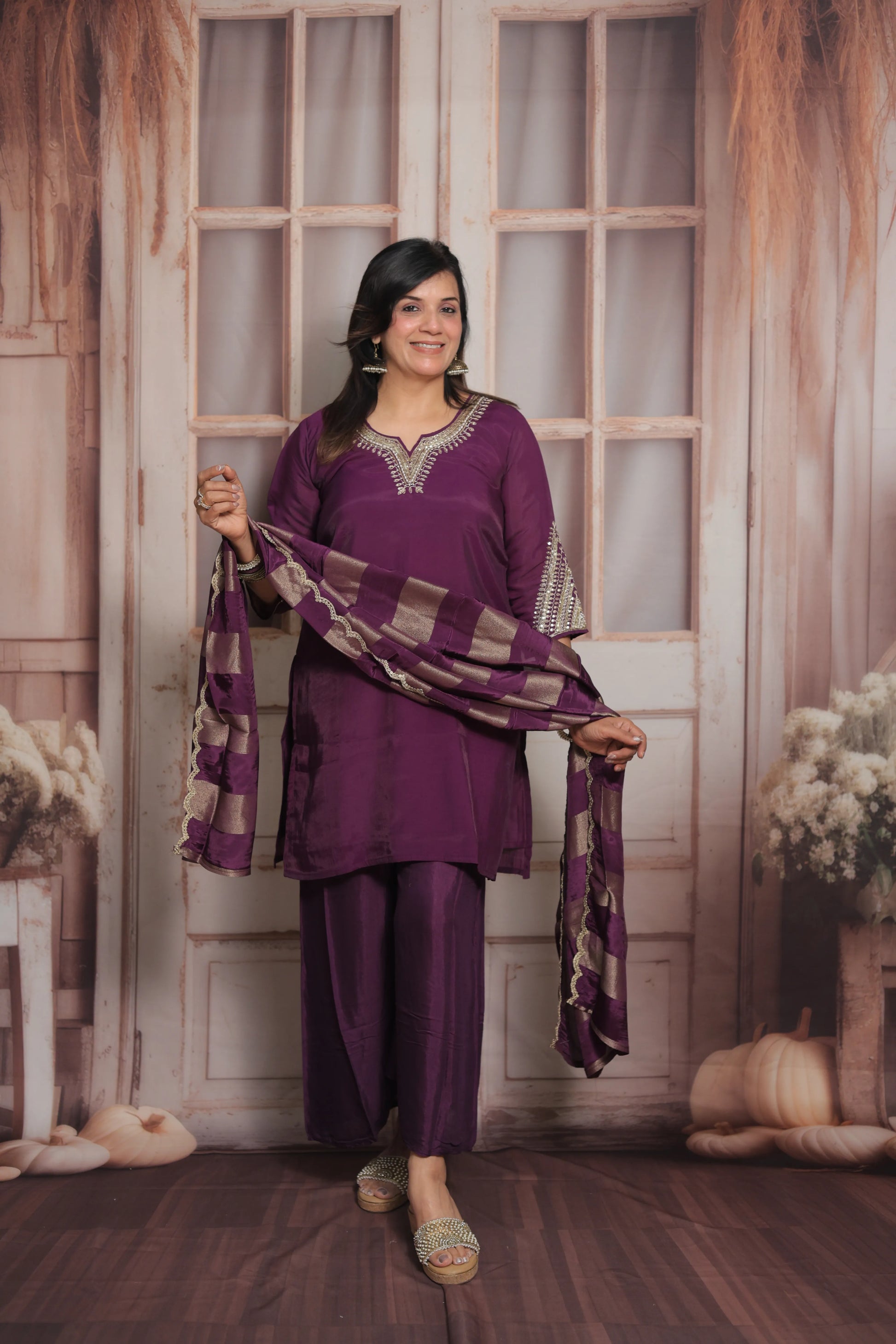 Add a royal charm to your festive wardrobe with this Dark Purple Short Kurta Dupatta Set, designed to exude elegance and grace. Crafted from premium mul chanderi fabric, the outfit features intricate sequins and pearl embroidery work, creating a perfect blend of shimmer and sophistication. The rich dark purple hue enhances its festive appeal, making it ideal for celebrations, family functions, or evening gatherings.