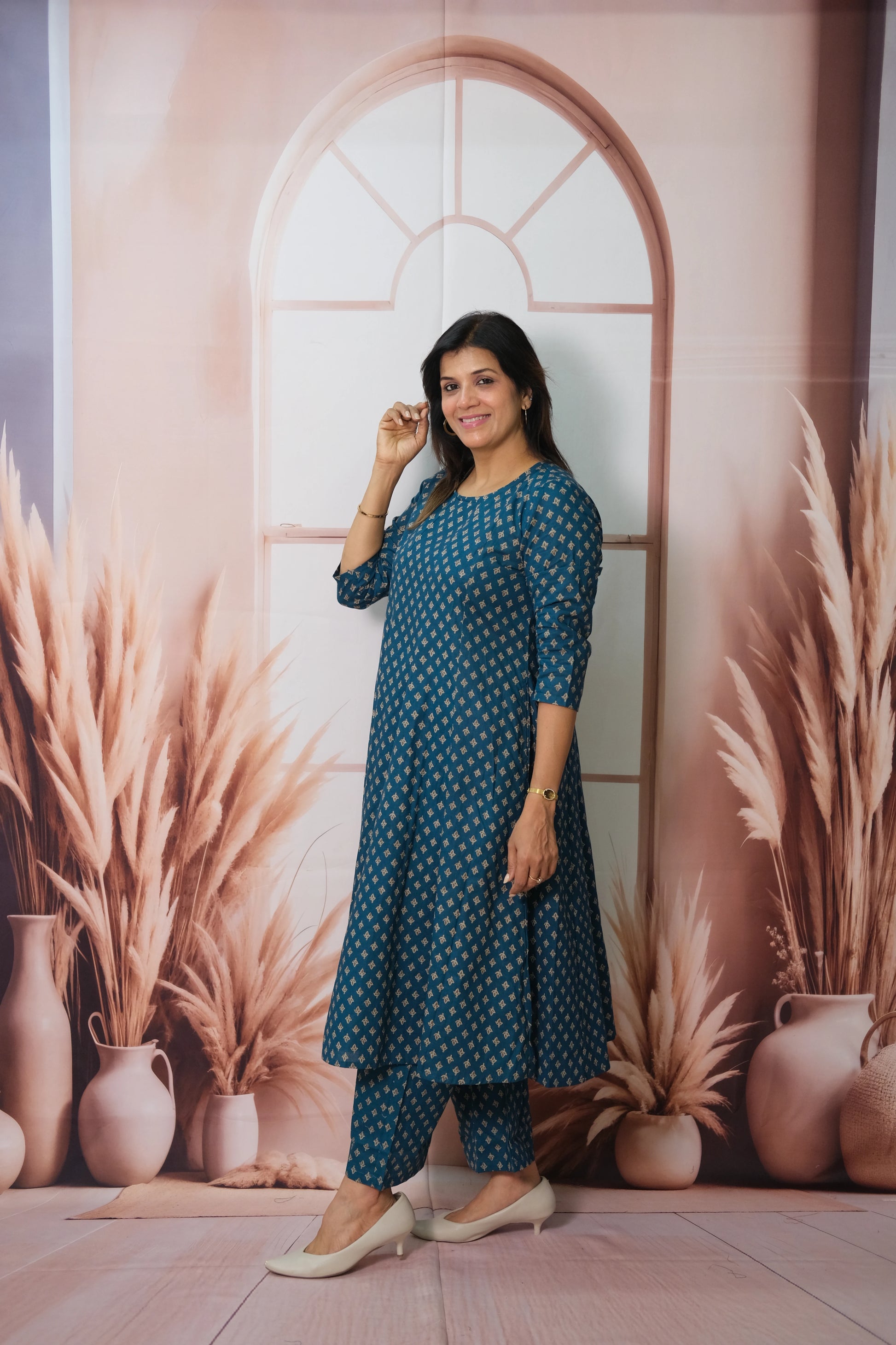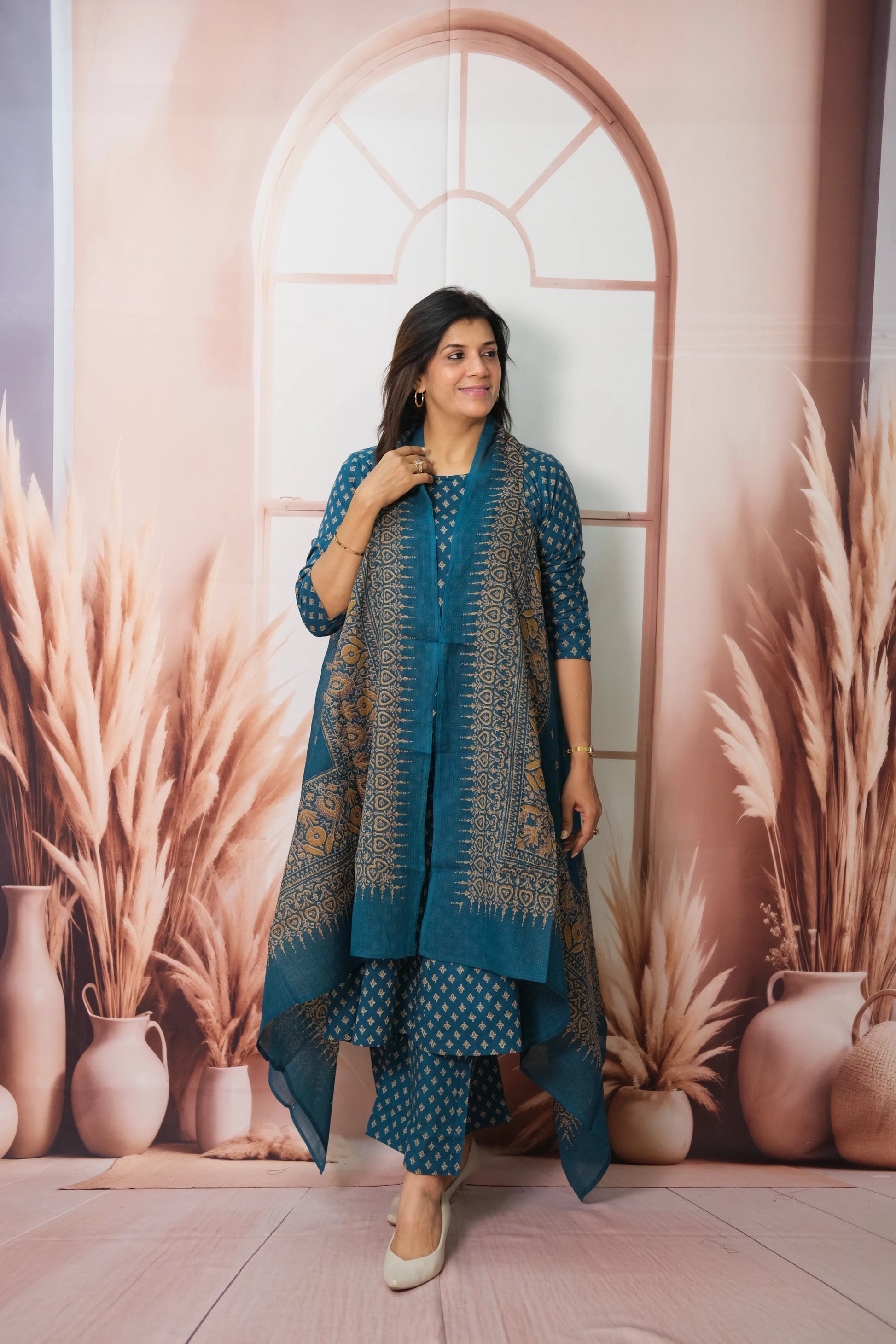 Dark Rama Kurta Pant Set with Shrug – Printed Cotton Elegance