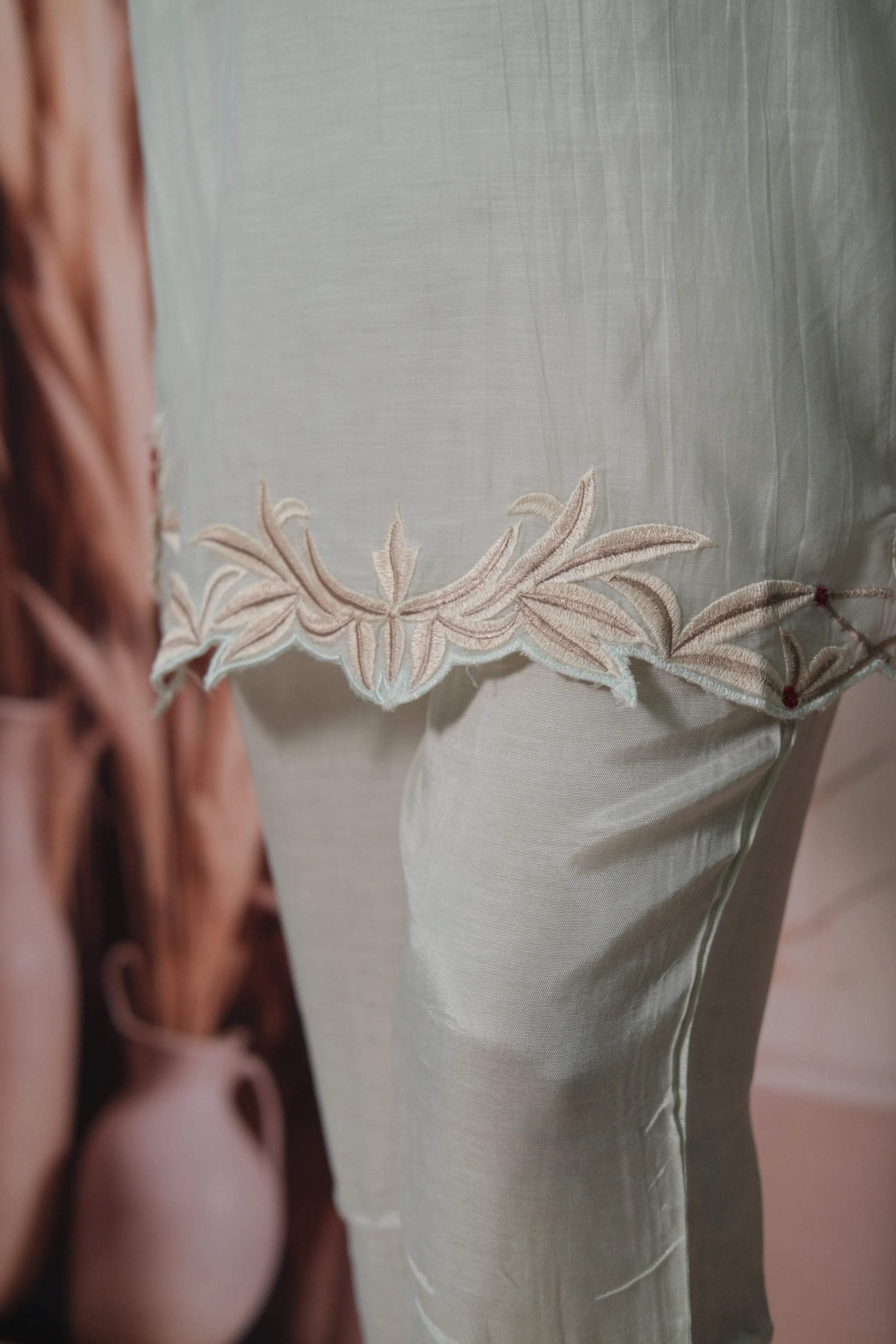 Glacial Green Mul Chanderi Co'ord Set with Cut Work & Embroidery