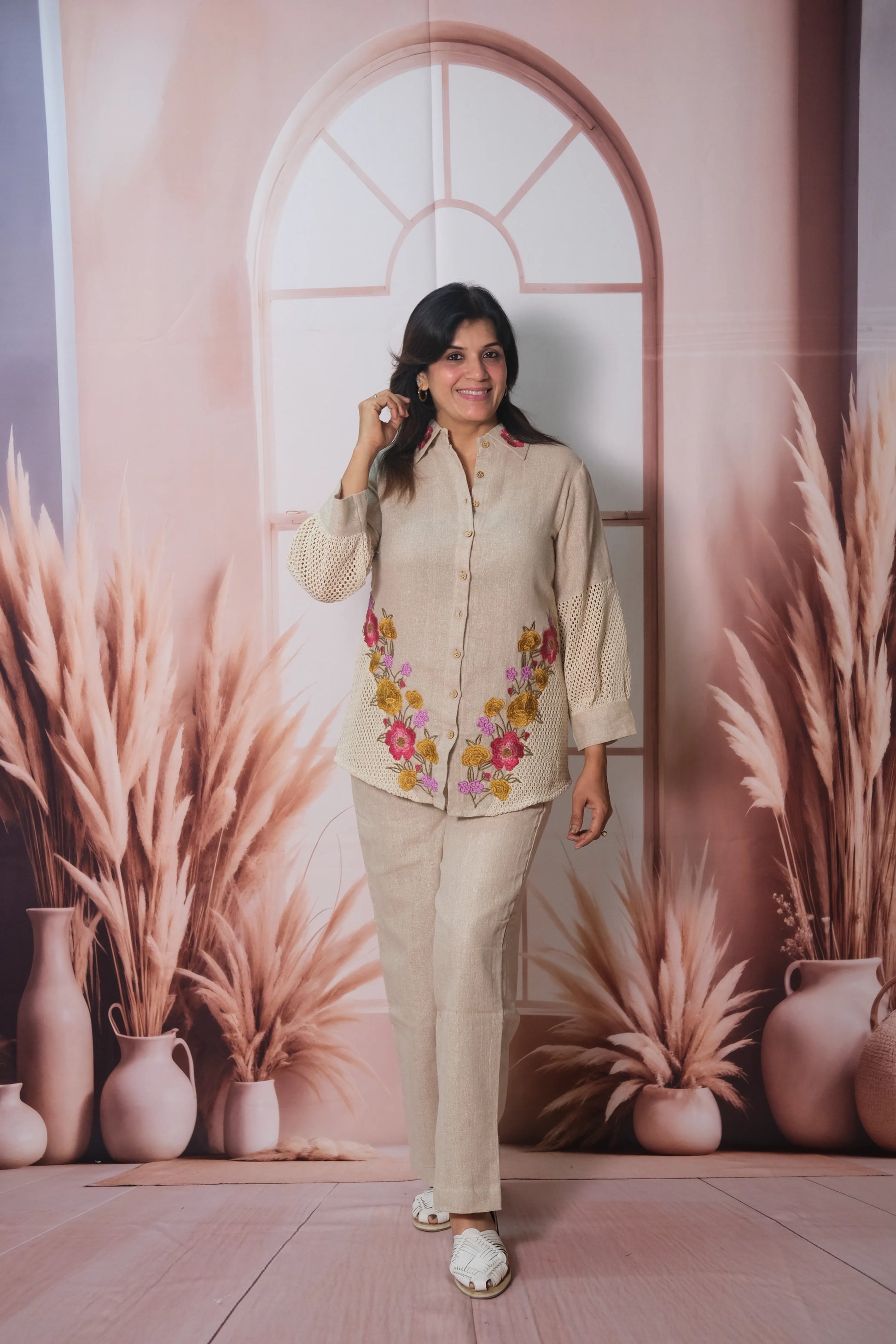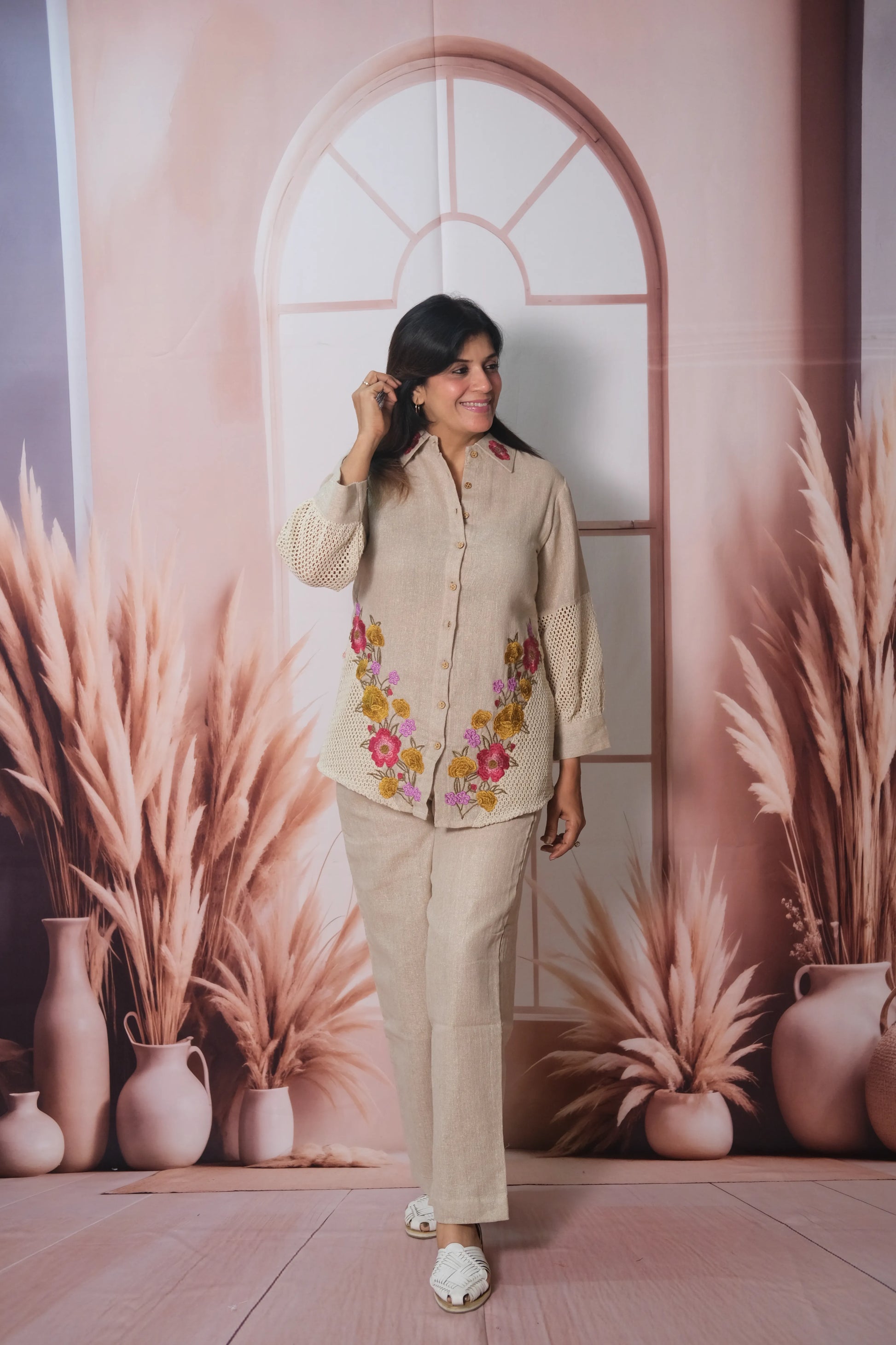 Elevate your ethnic wardrobe with this Jute Co-ord Set featuring handcrafted patch work and a soft Mul cotton lining for extra comfort. A perfect blend of raw elegance and everyday wearability, ideal for conscious fashion lovers.