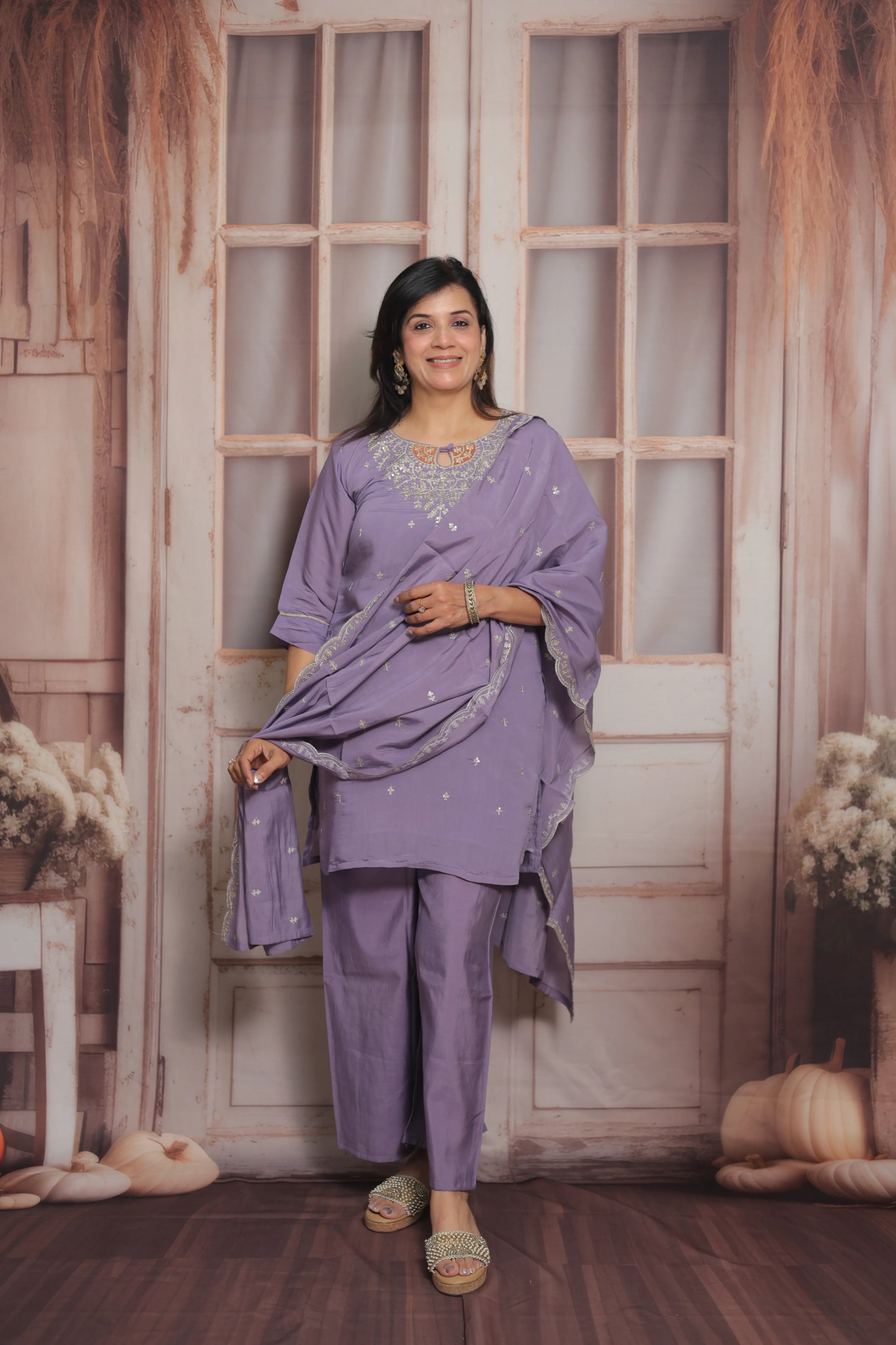 Embrace subtle elegance with this Lavender Short Kurta Dupatta Set, crafted from luxurious mul chanderi fabric for a graceful festive look. The soothing lavender hue is elevated with delicate sequins embroidery work, adding a soft shimmer that perfectly balances simplicity and style. Designed for comfort and sophistication, this set is ideal for festive occasions, family gatherings, or elegant daytime events.