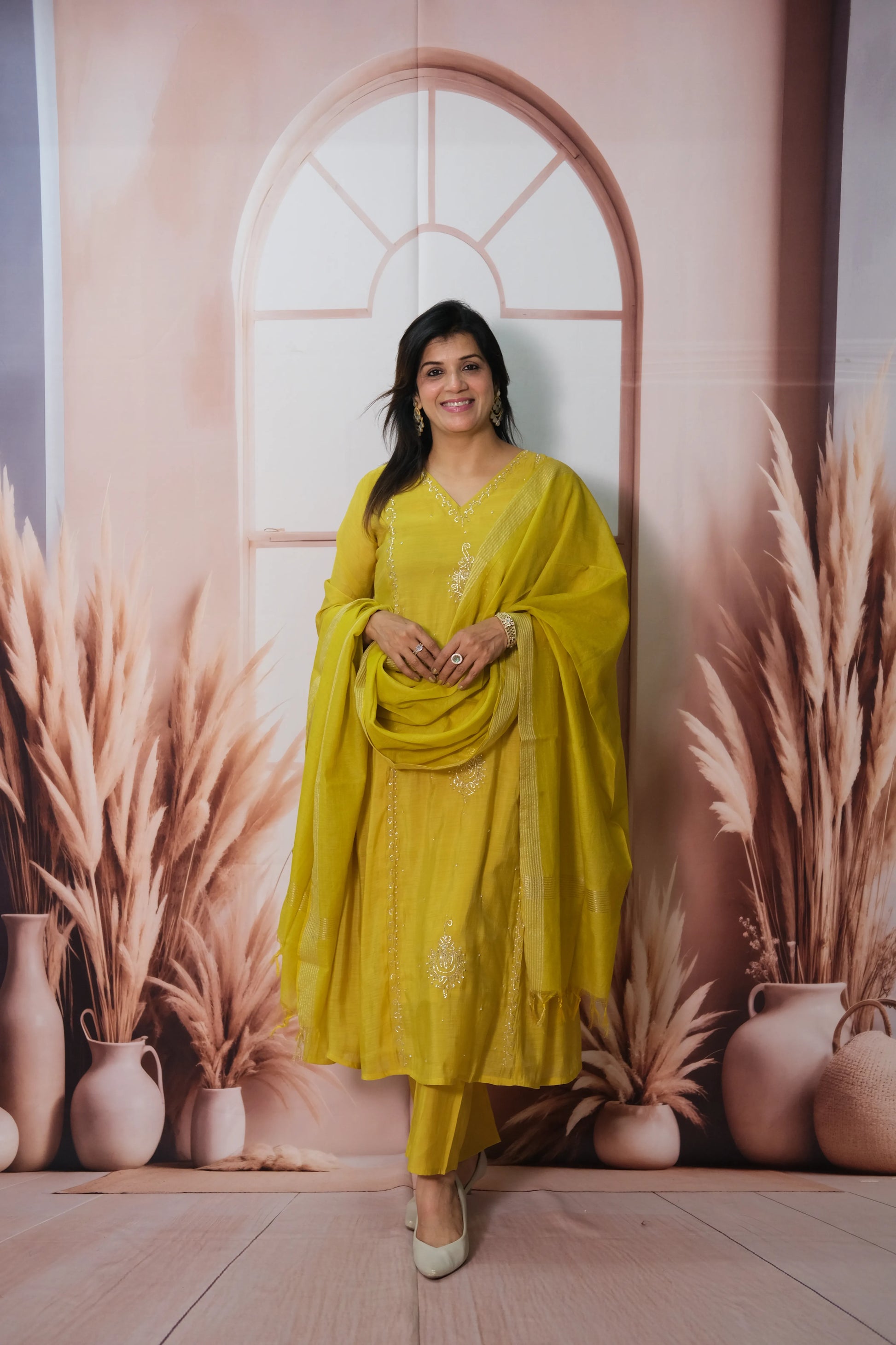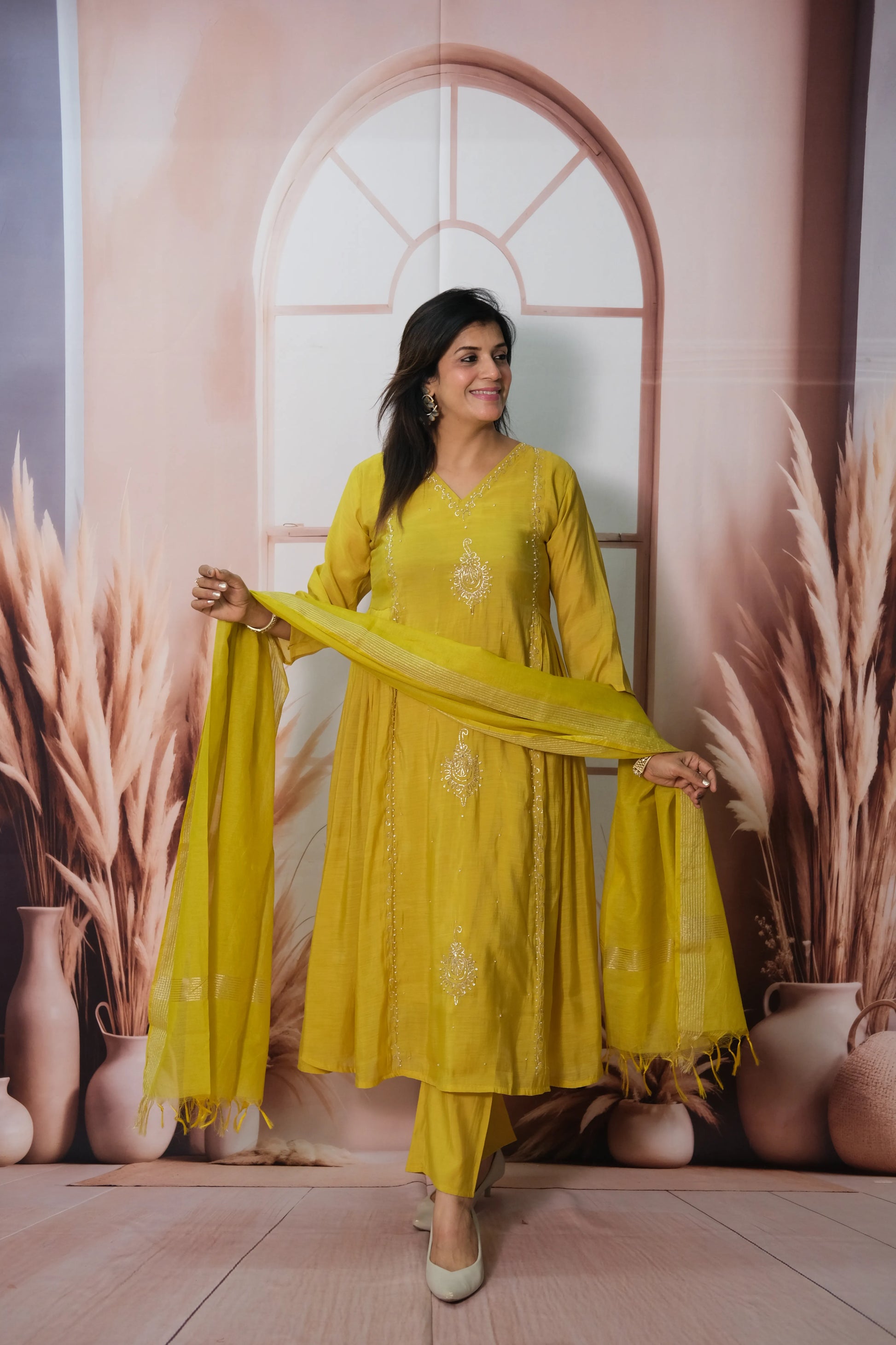 Munsell Yellow Mul Chanderi Anarkali Dupatta Set with Pearl Embroidery