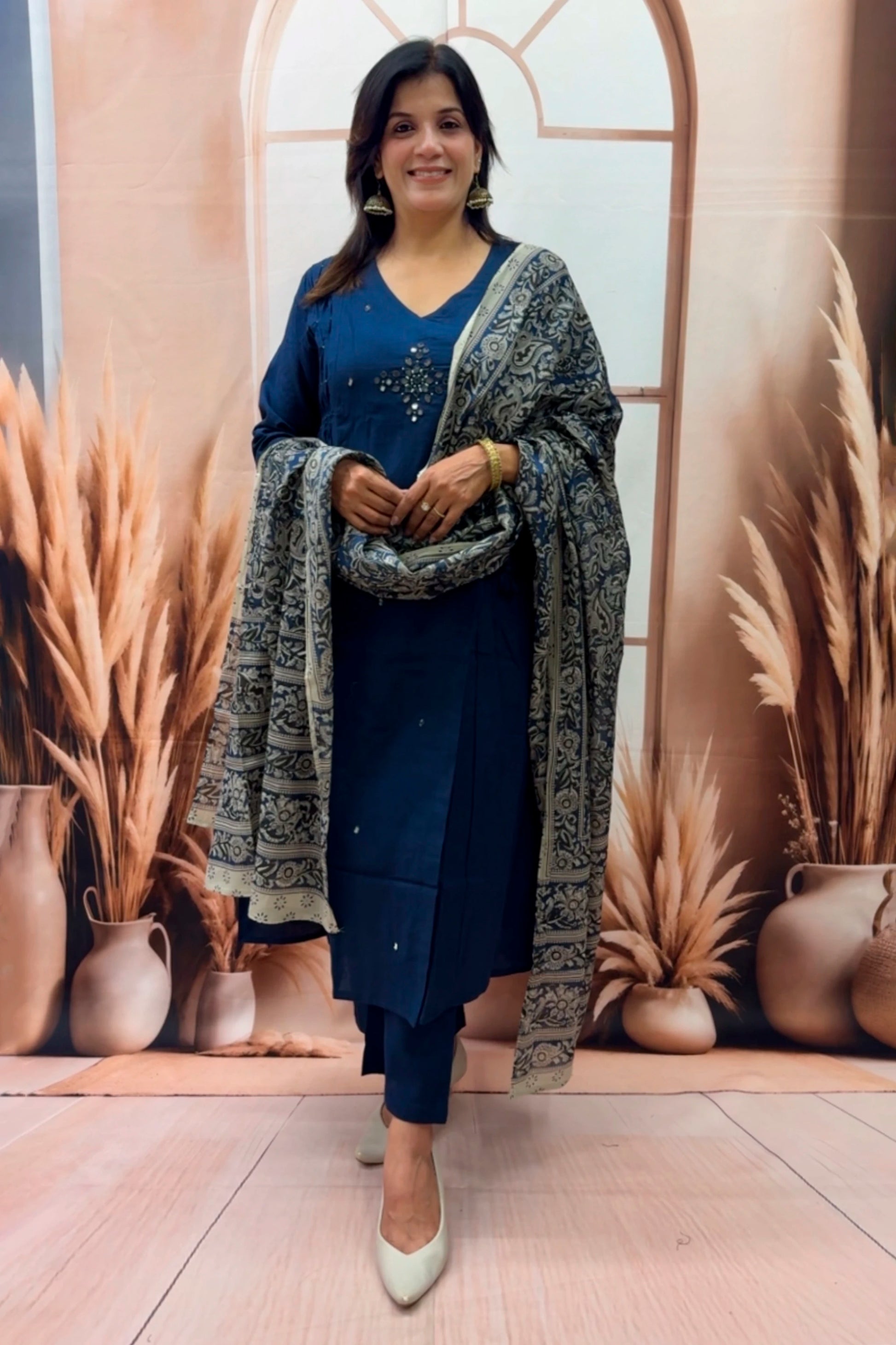 Add a classic ethnic charm to your wardrobe with this Navy Blue Kurta Dupatta Set, made from breathable cotton fabric for all-day comfort. The kurta features elegant mirror work that adds a festive sparkle, while the Ajrakh printed dupatta lends a touch of timeless artistry. Perfect for casual festivities, family get-togethers, or day functions, this set beautifully balances traditional craftsmanship with everyday elegance.