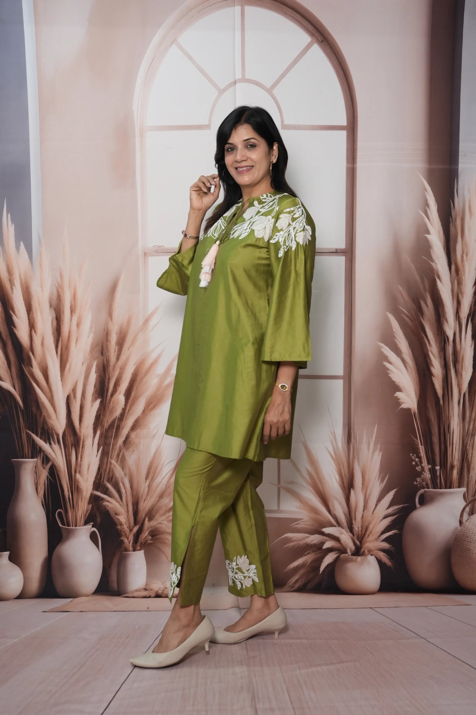 Olive Green Muslin Silk Co'ord Set with Thread Embroidery | Elegant Festive Wear