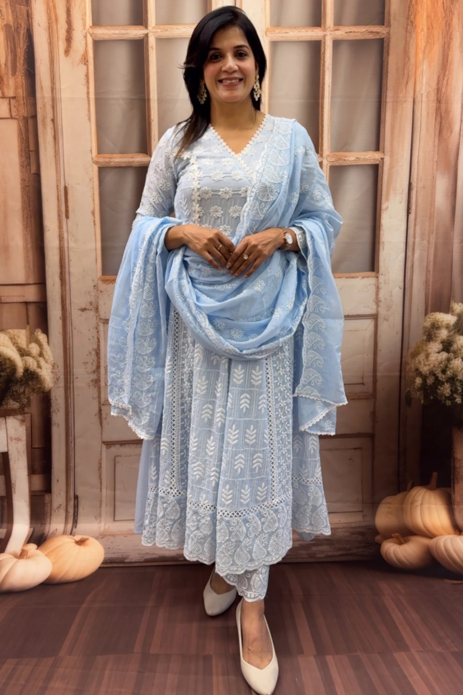 Powder Blue Lakhnavi Anarkali Kurti Dupatta Set | Intricate Lakhnavi Work