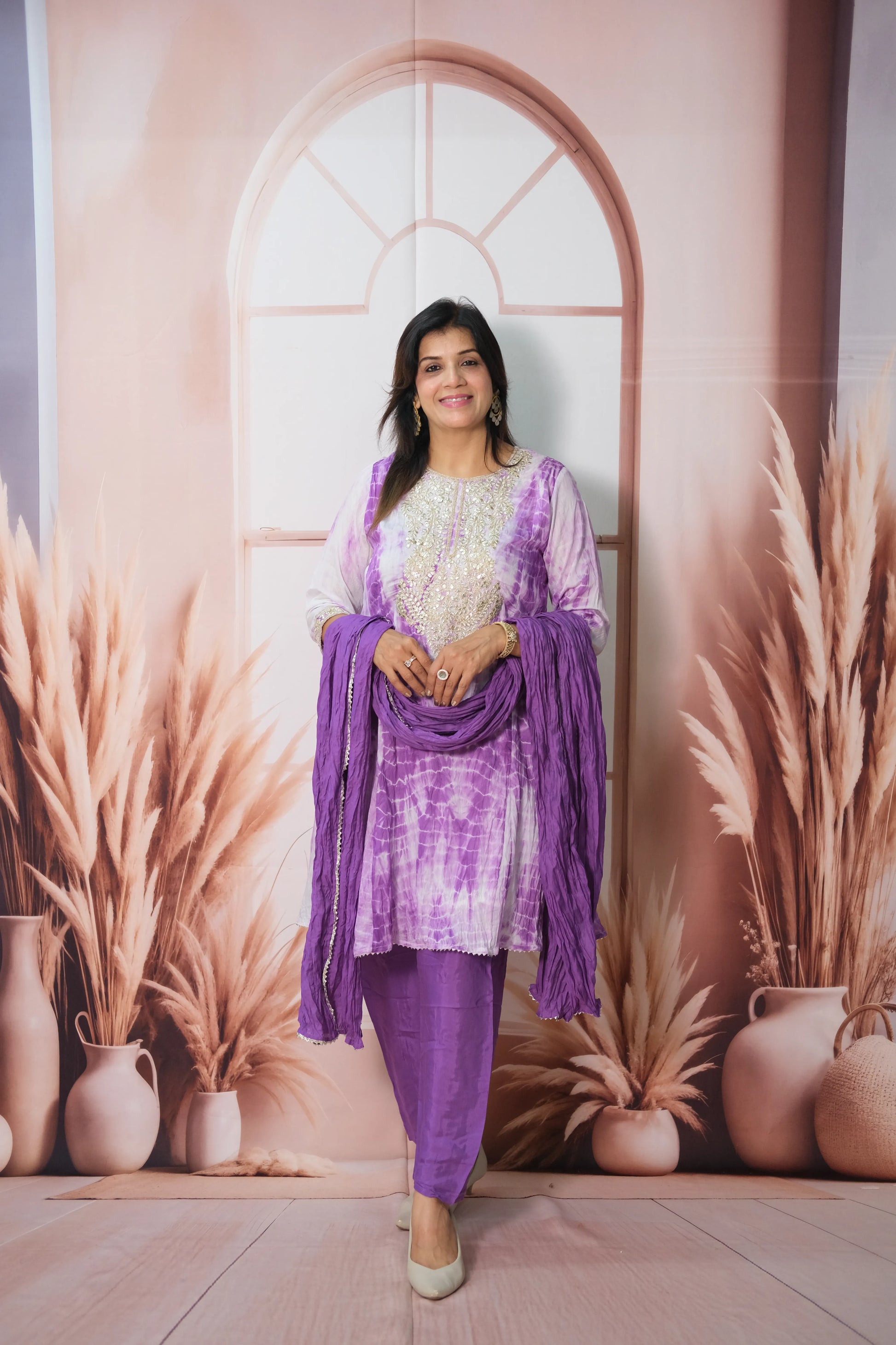 Purple Tie & Dye Mul Chanderi Knee-Length Kurta Dupatta Set