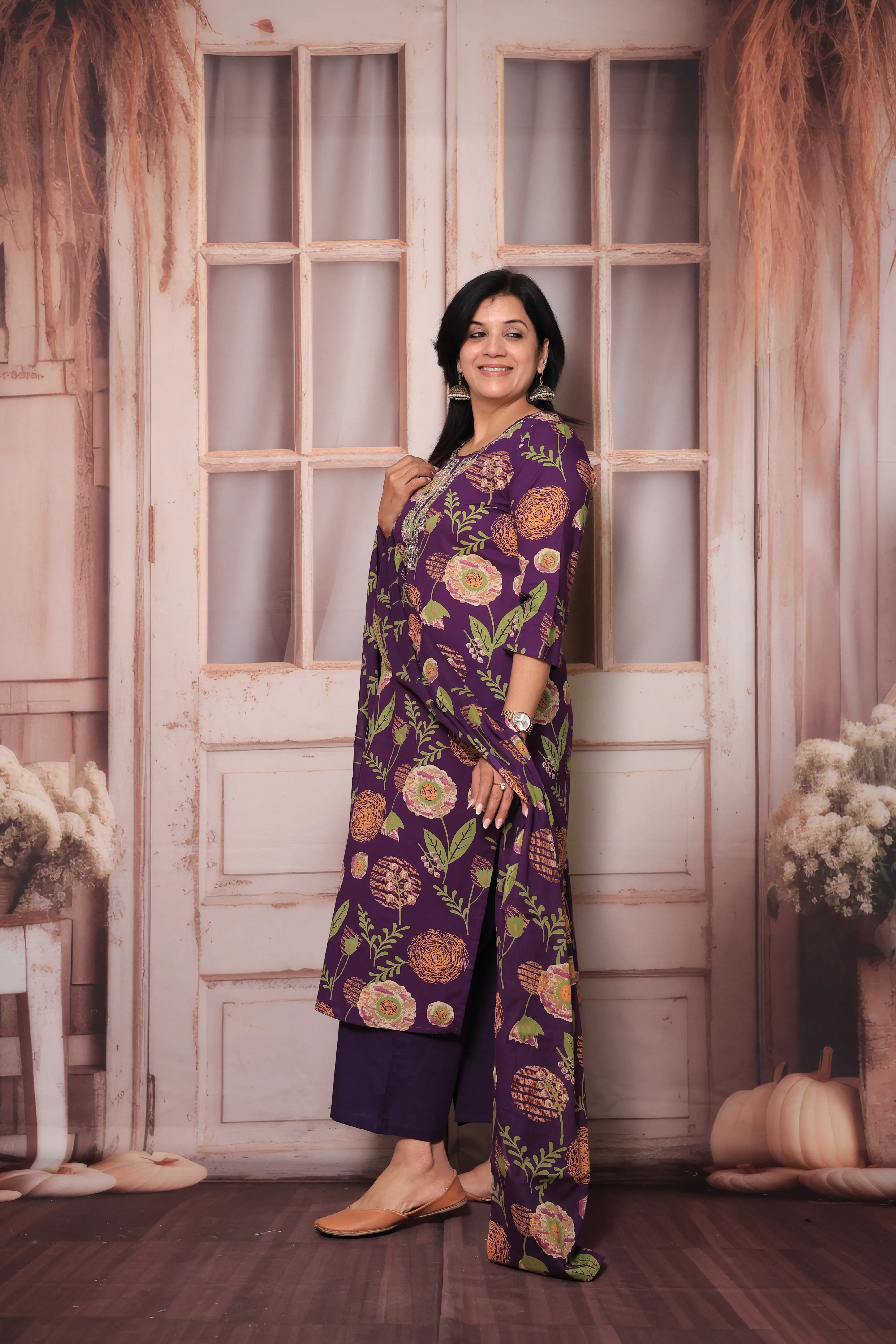 Purple Yoke Embroidered Kurta Pant Set with Dupatta | Digital Floral Print