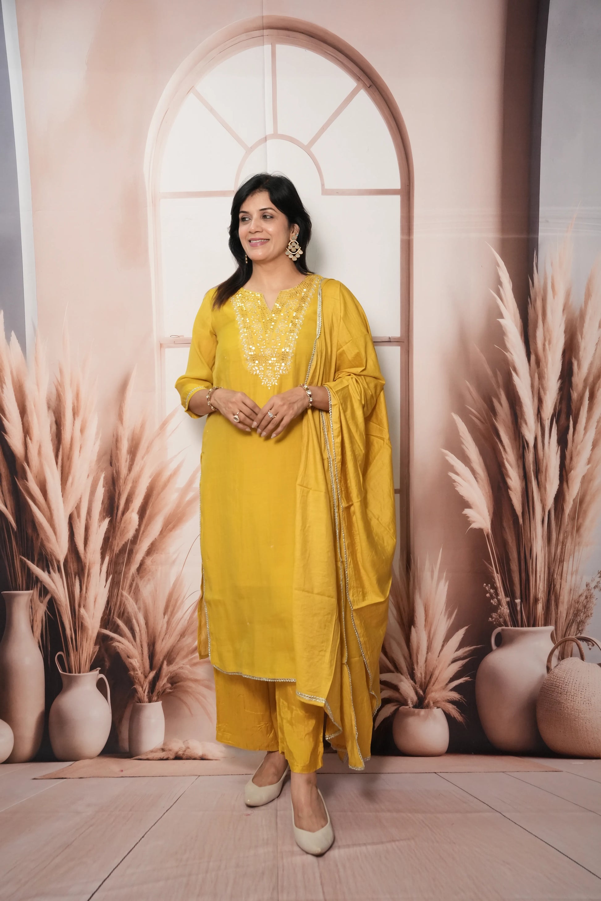 Rape Yellow Mul Chanderi Kurta Dupatta Set with Sequin & Embroidery Work