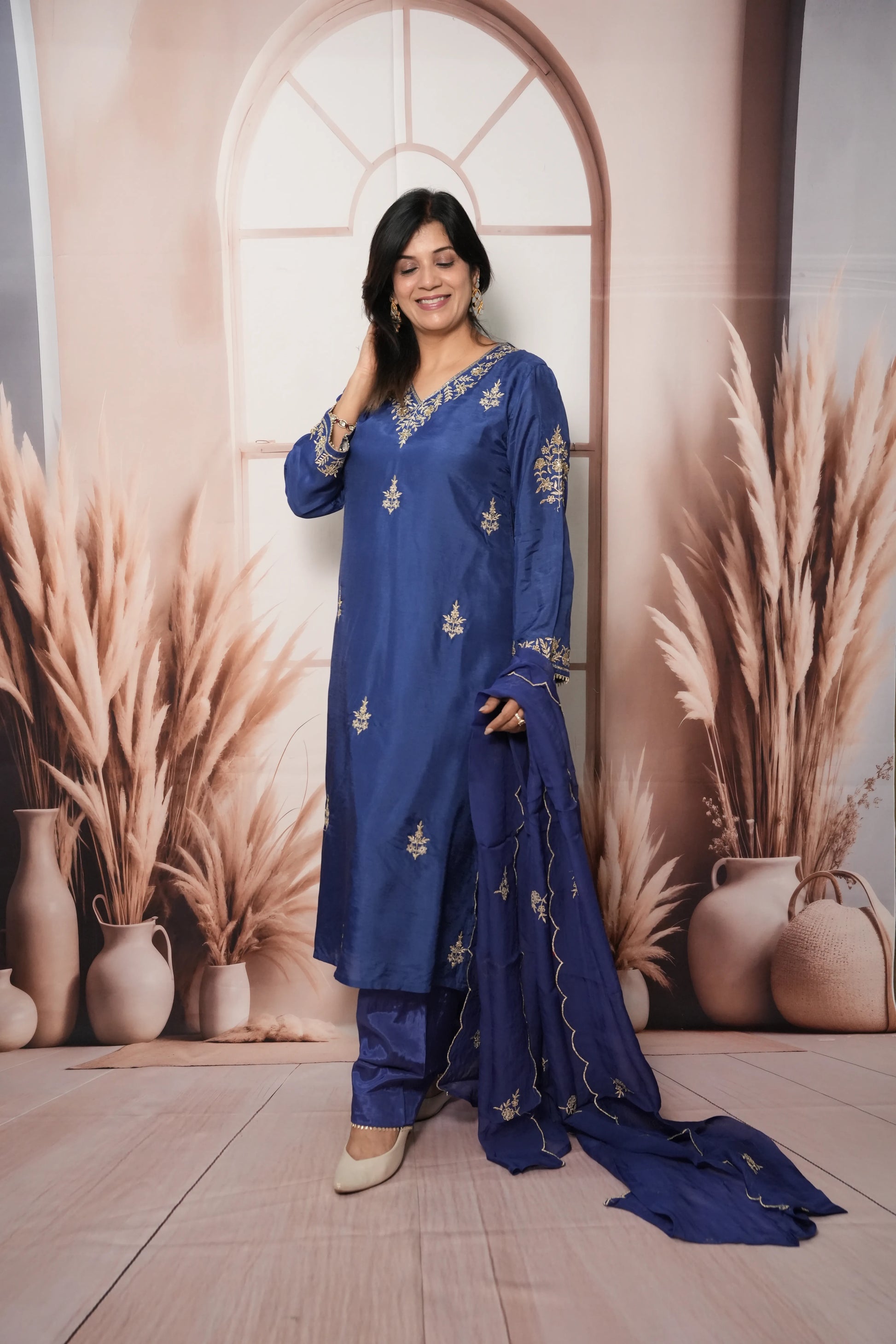 Radiate timeless elegance with our Royal Blue A-Line Kurta Dupatta Set, tailored from luxurious pure silk fabric that drapes beautifully and adds a regal sheen. Adorned with delicate pearl and sequin embroidery, this ensemble blends sophistication with festive charm. The graceful A-line silhouette ensures a flattering fit, making it ideal for weddings, celebrations, and festive evenings.
