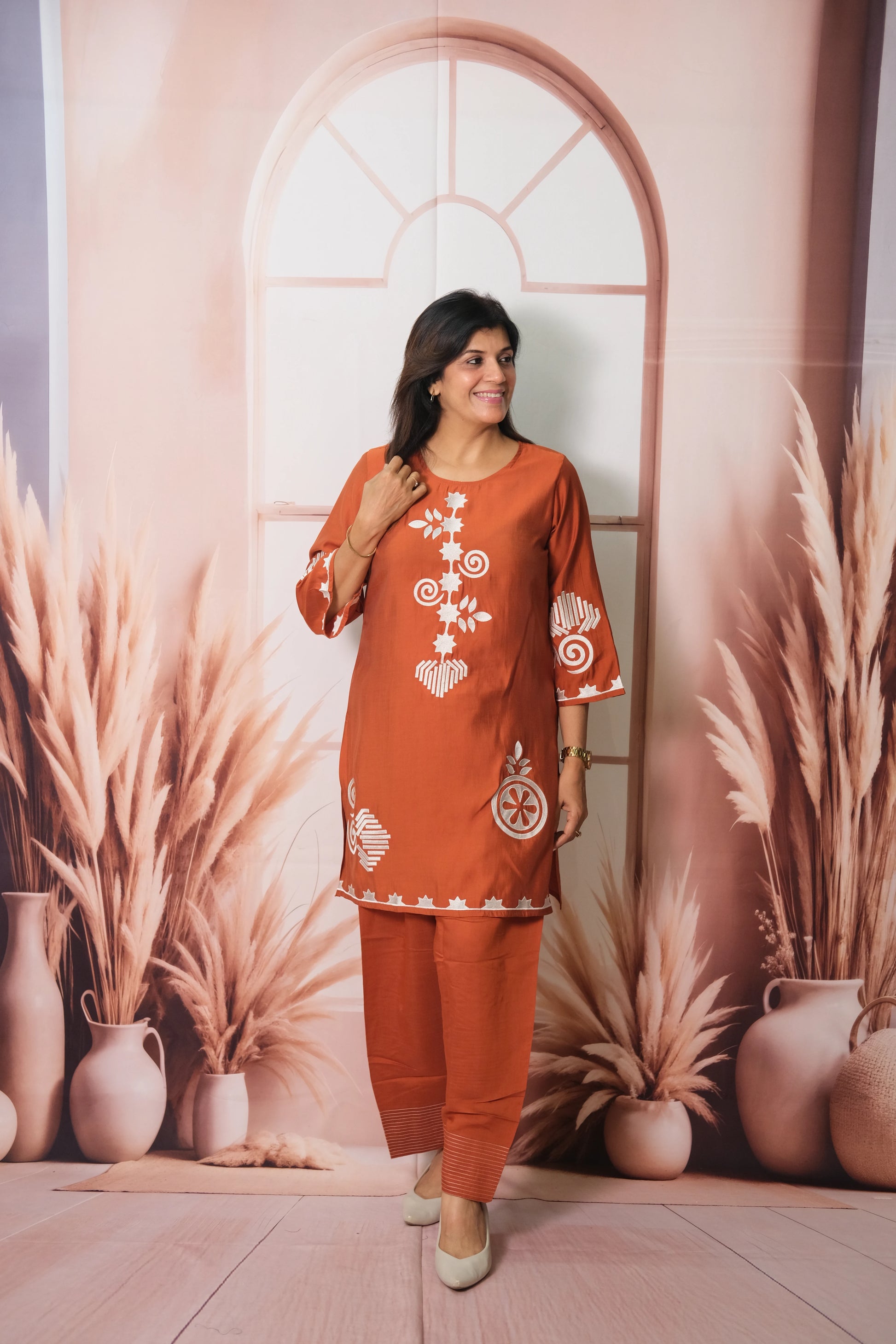 Rust Co-ord Set in Muslin with Embroidery – Graceful Festive Wear