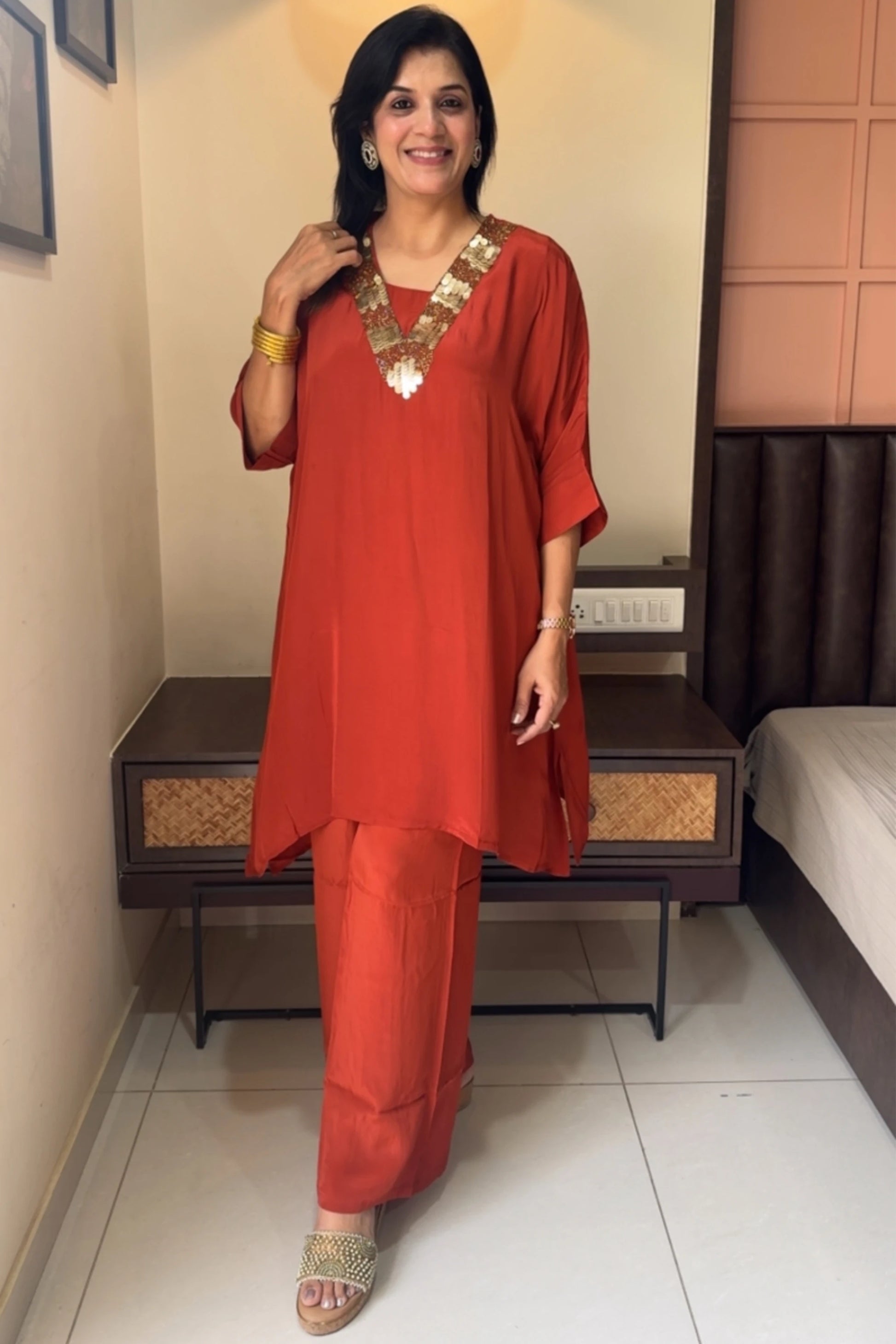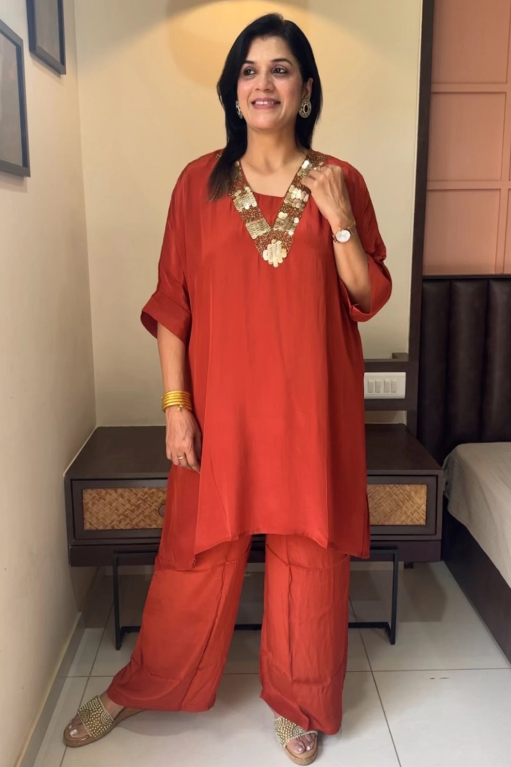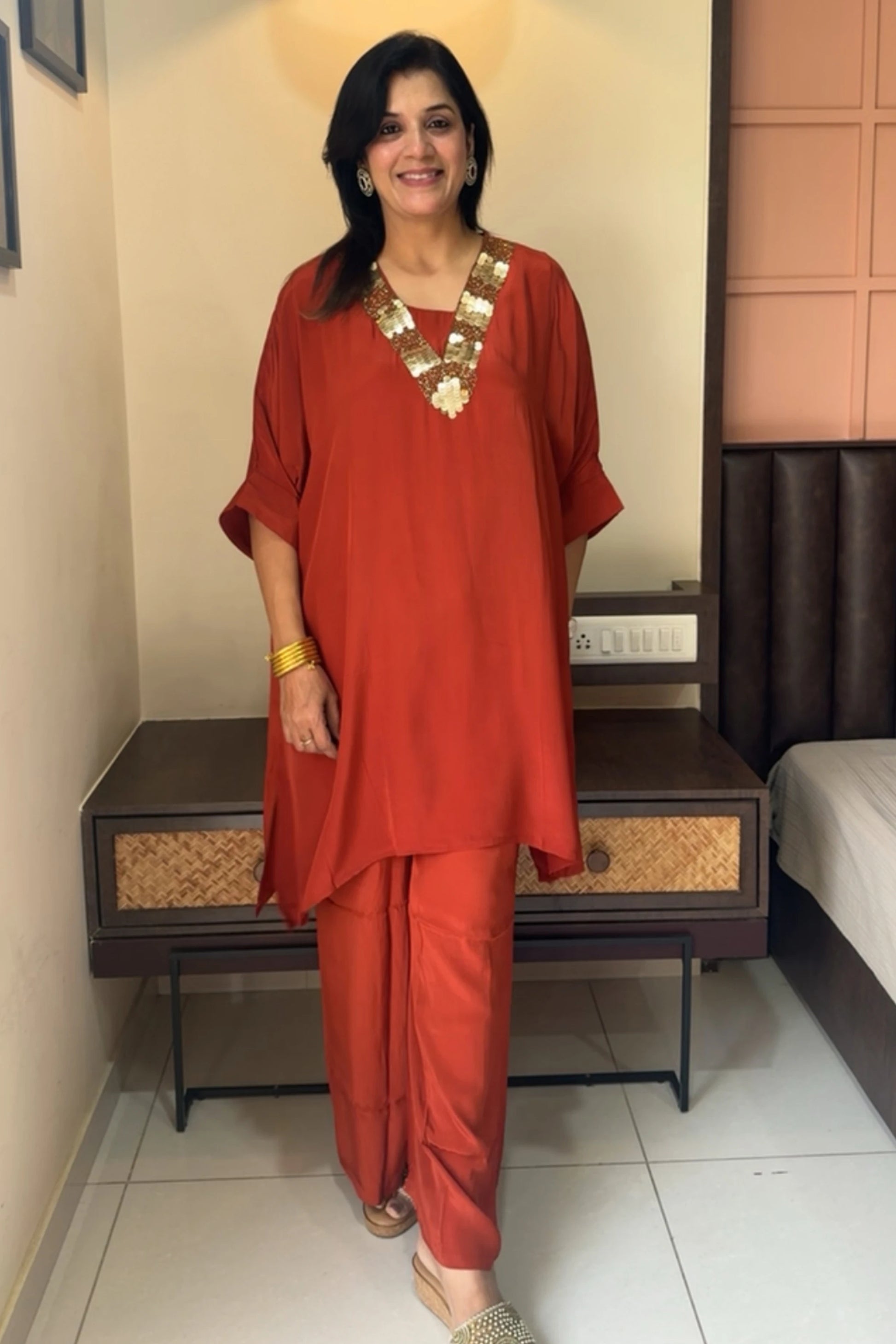 Rust Tale Cut Co-ord Set | Premium Crepe | Sequins & Thread Embroidery