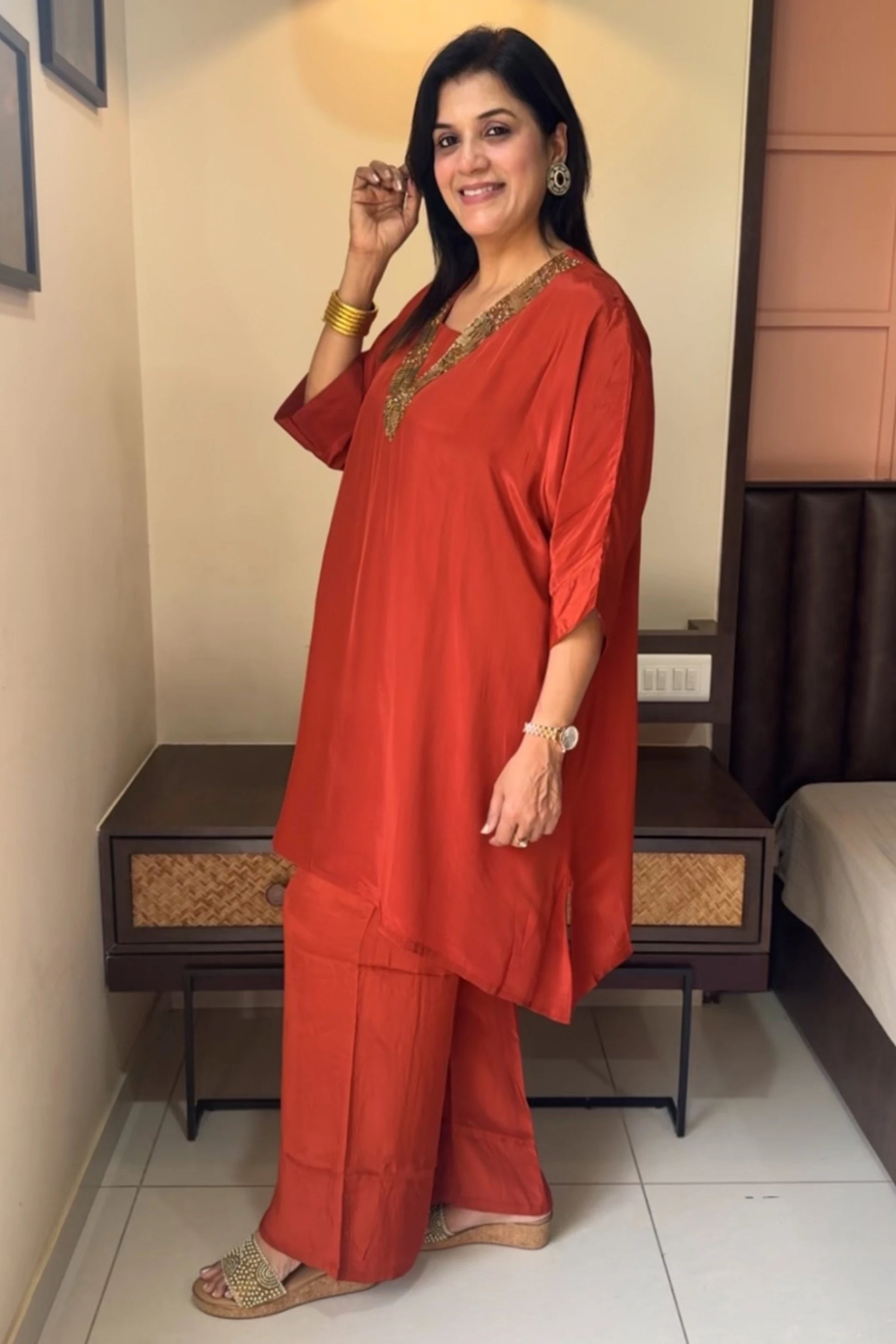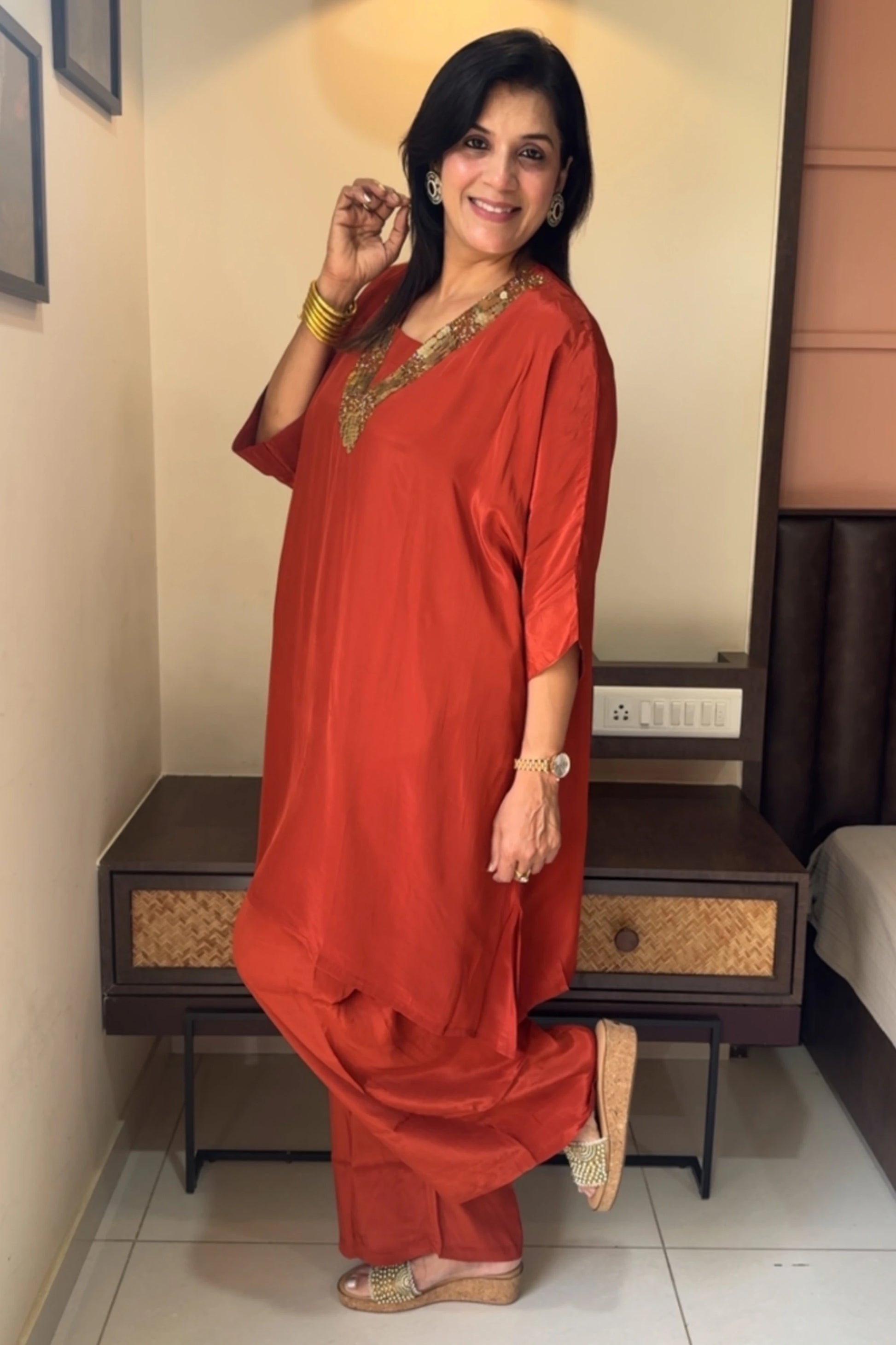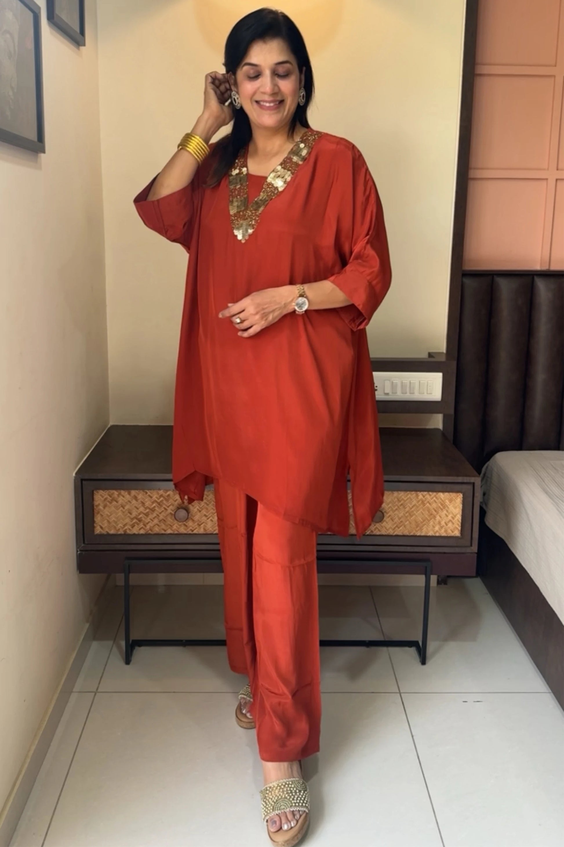 Rust Tale Cut Co-ord Set | Premium Crepe | Sequins & Thread Embroidery