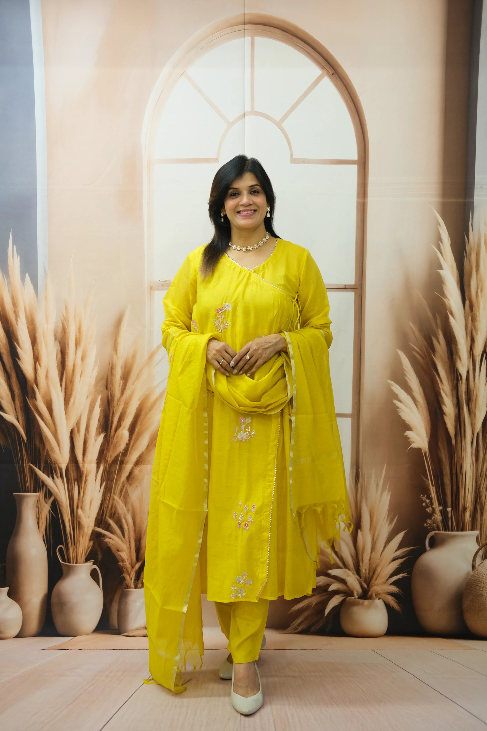 Sunshine Yellow Mul Chanderi Angrakha Style Dupatta Set with Pearl Embroidery