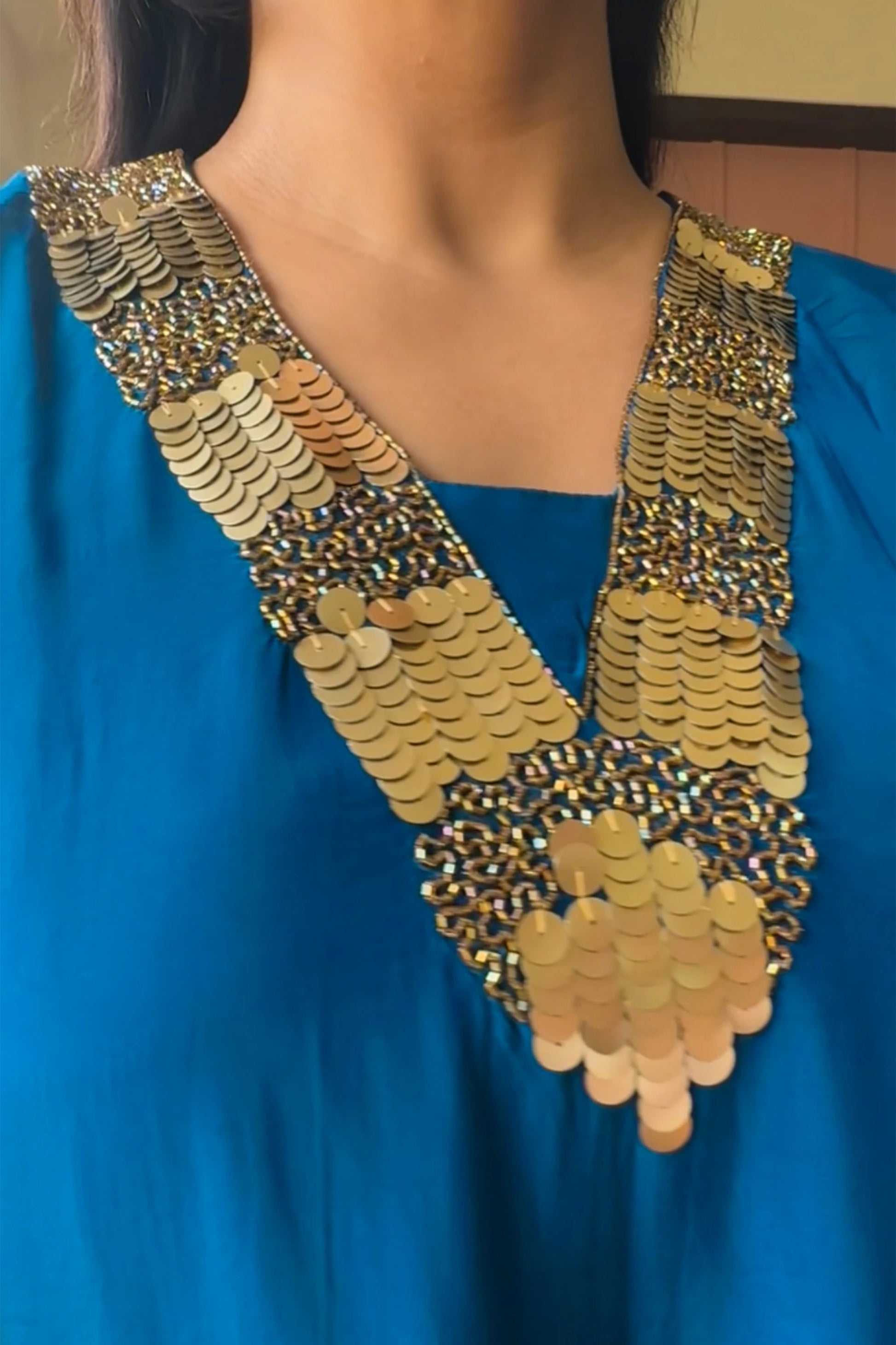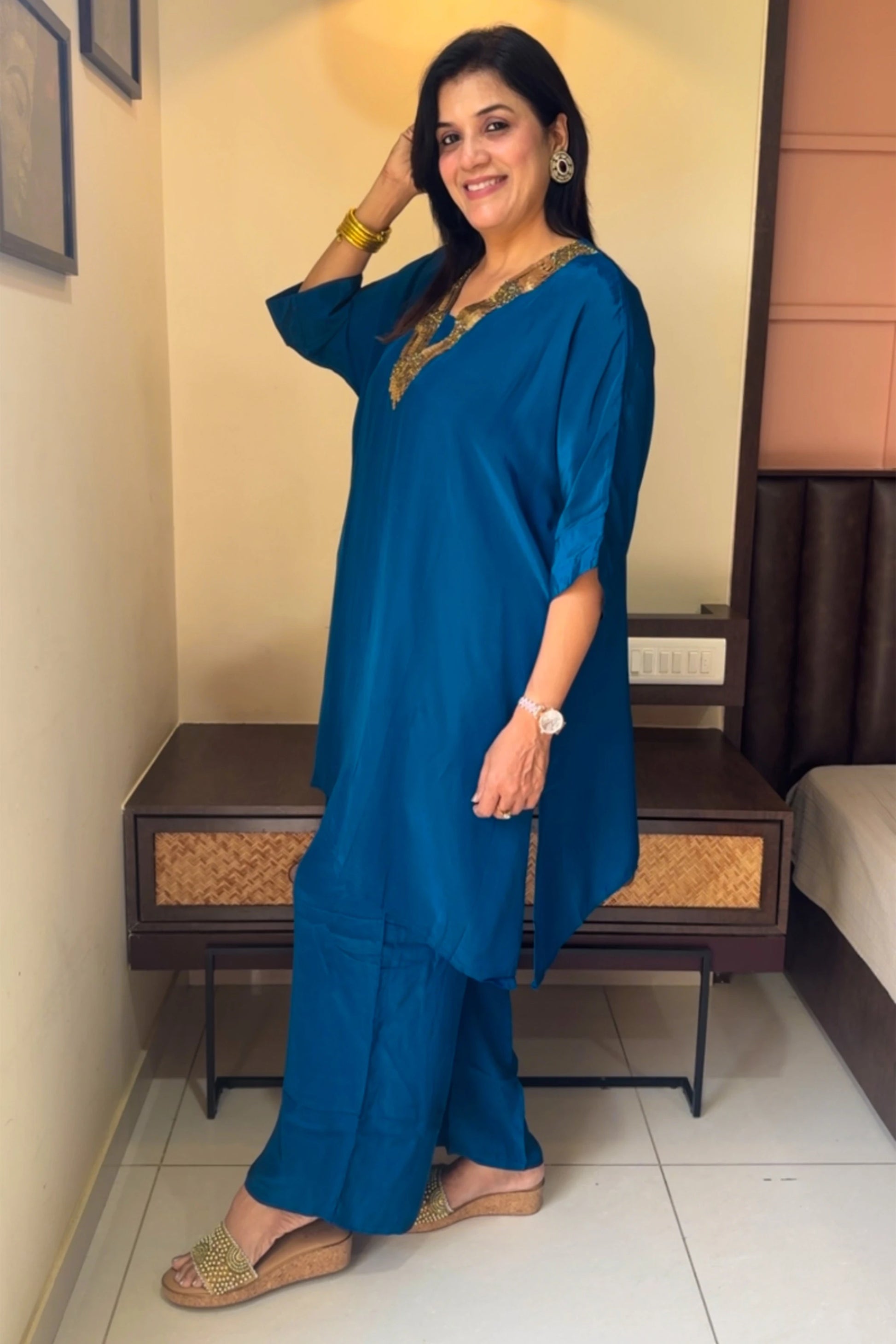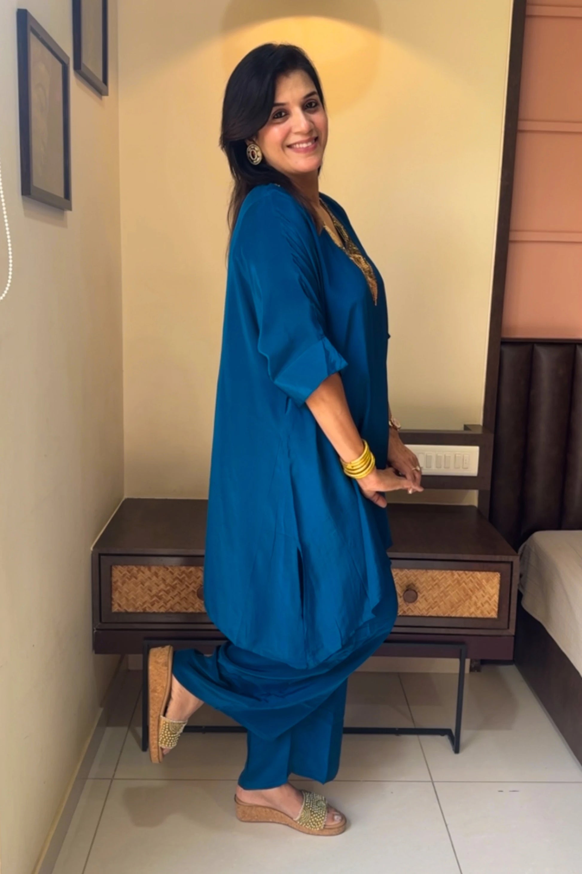 Teal Blue Tale Cut Co-ord Set | Premium Crepe | Sequins & Thread Embroidery
