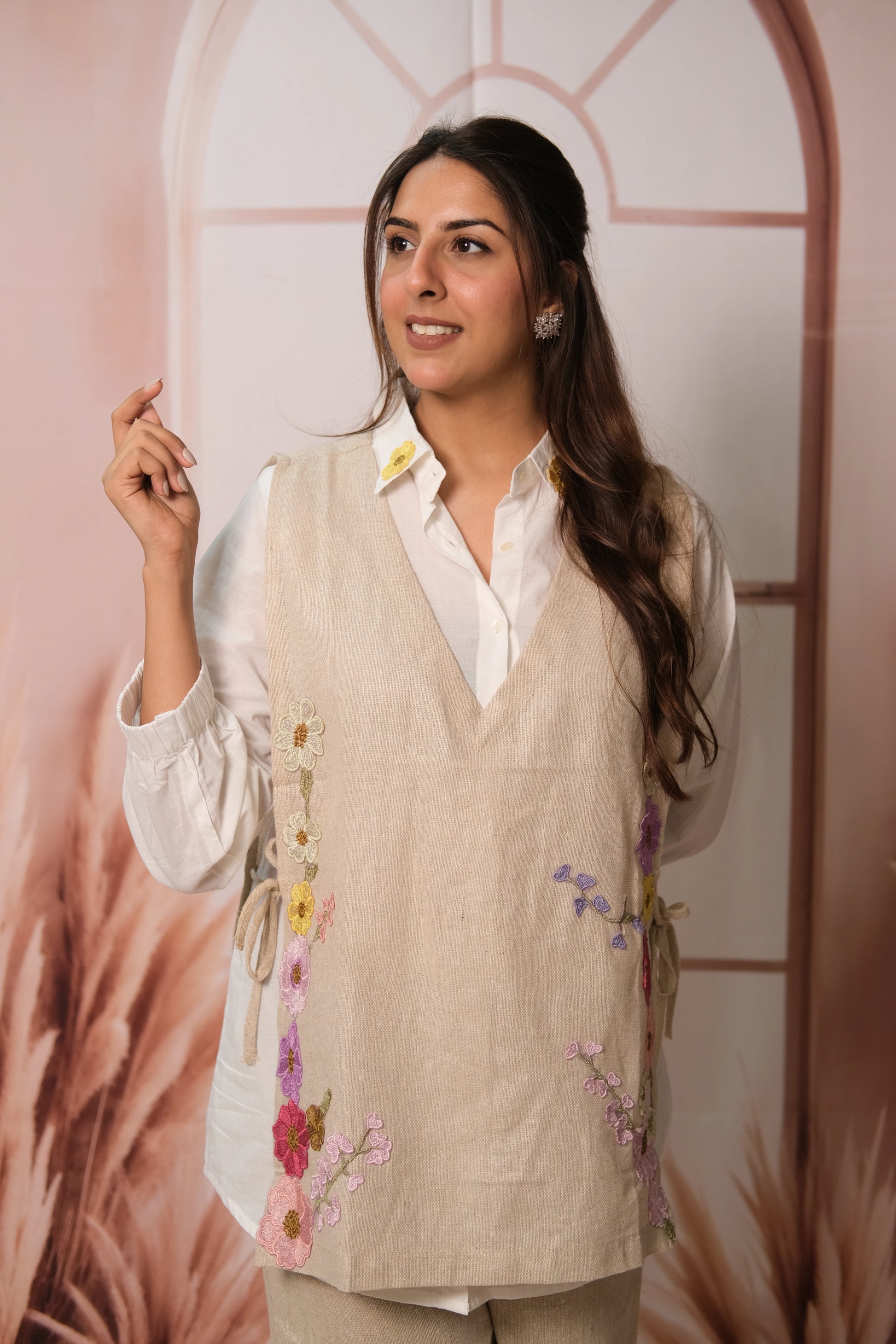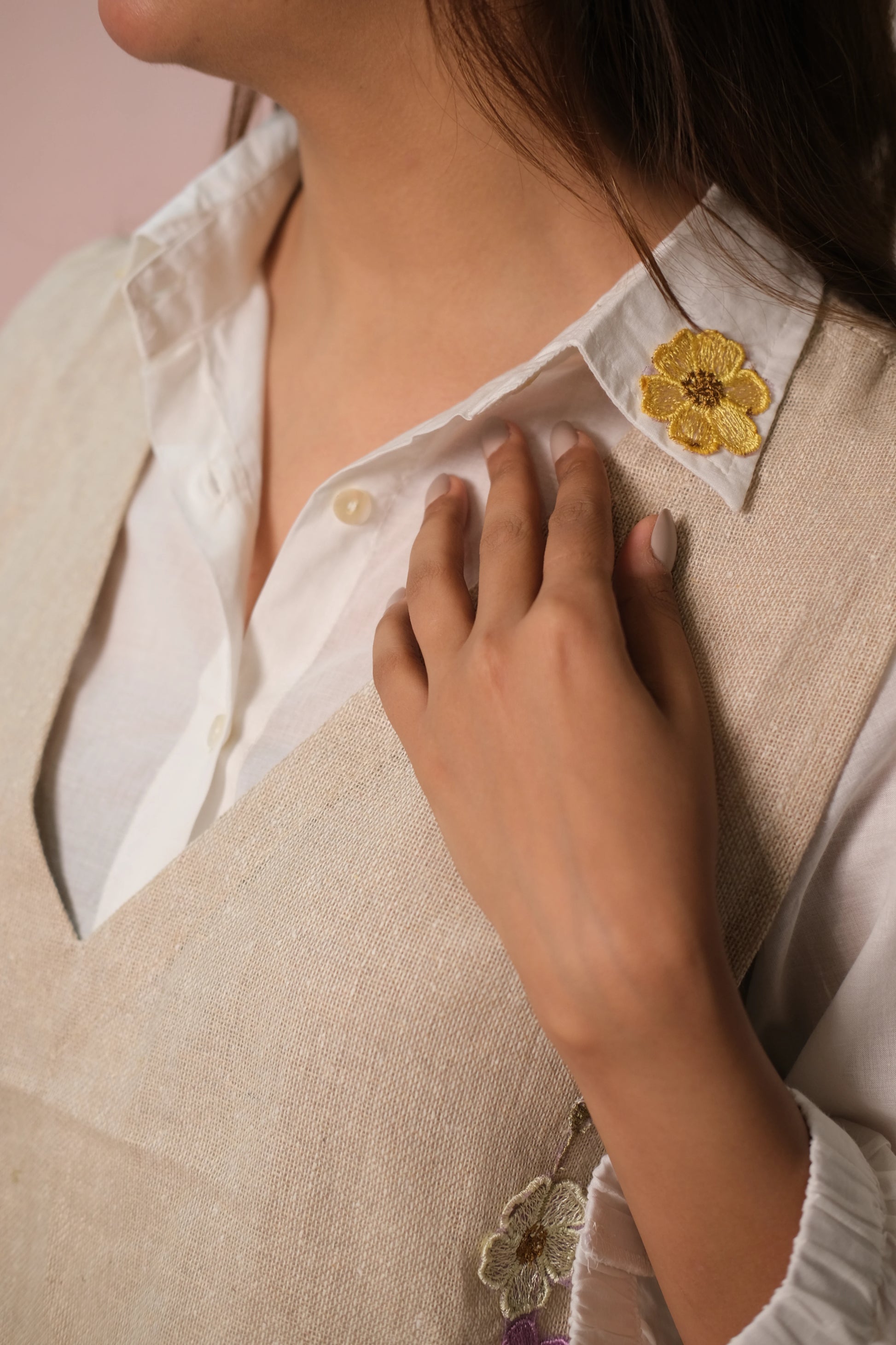 White & Beige Co-ord Set – Embroidered Cotton & Jute Dress with Apron Layer