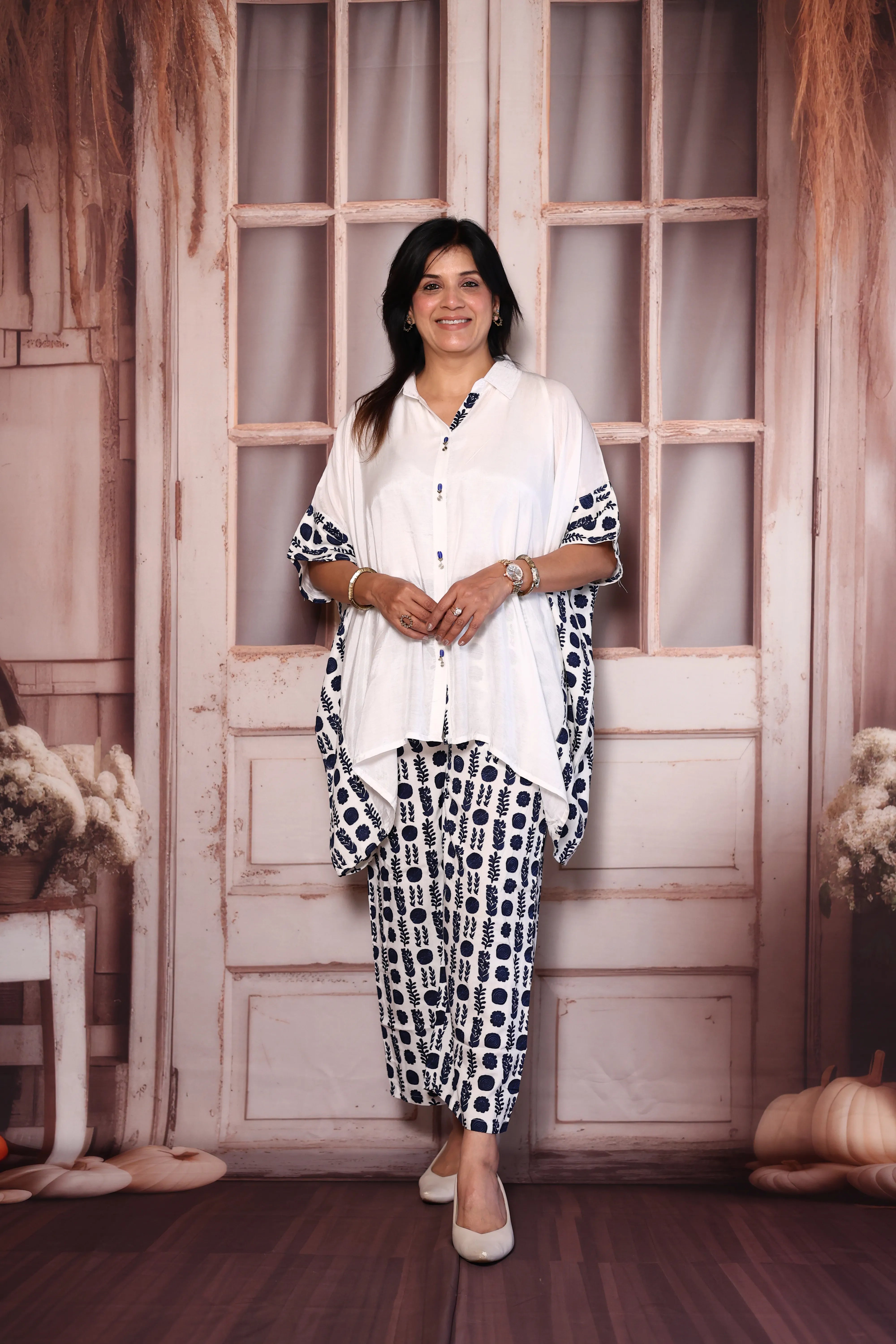 White & Blue Crepe Kaftan Co-Ord Set with Printed Pants | Collared Stylish Lounge Wear
