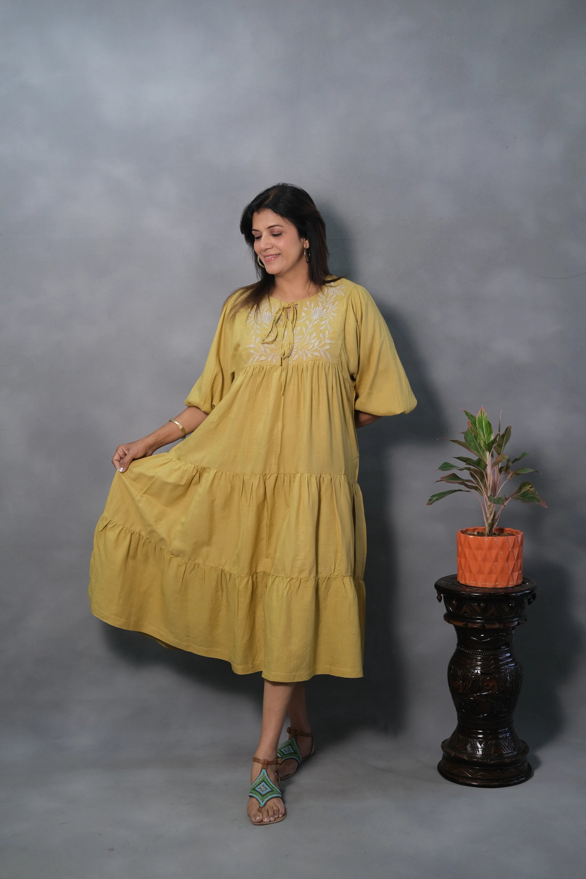 Yellow Oversized Embroidered One Piece Dress | Slub Cotton